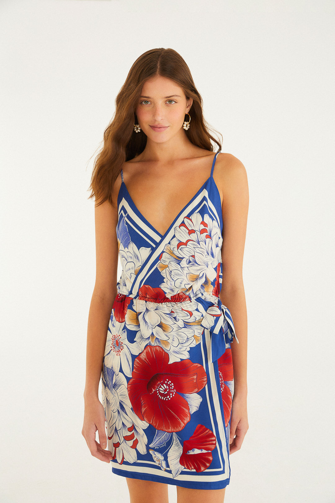 Vestido curto com estampa floral marcante em fundo azul intenso, trazendo um mix elegante de flores em branco e vermelho...