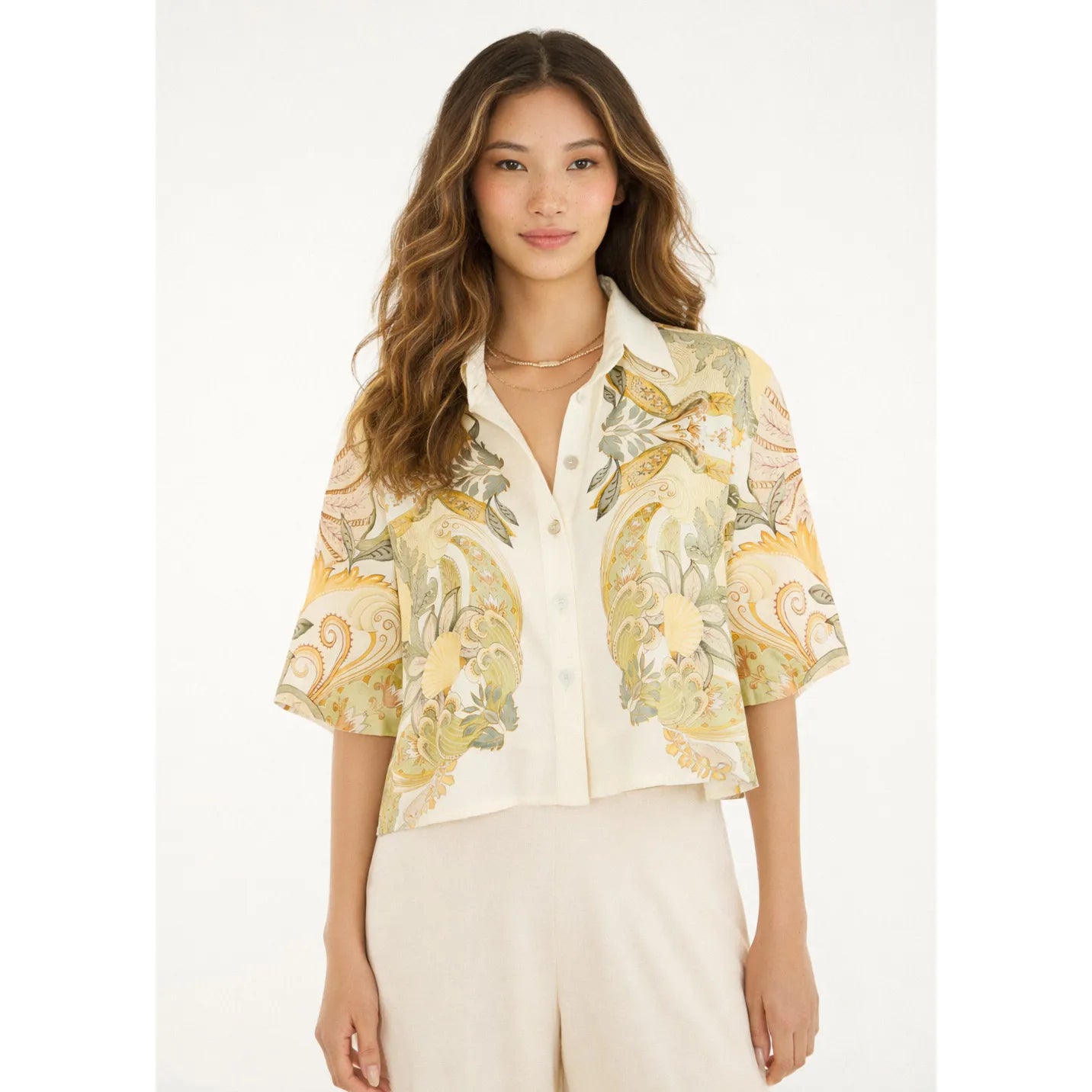 Seu tecido leve e fresco oferece alta respirabilidade, ideal para dias quentes e para composições versáteis. O corte amplo e as mangas curtas garantem liberdade de movimento, enquanto a modelagem cropped valoriza a silhueta com delicadeza.