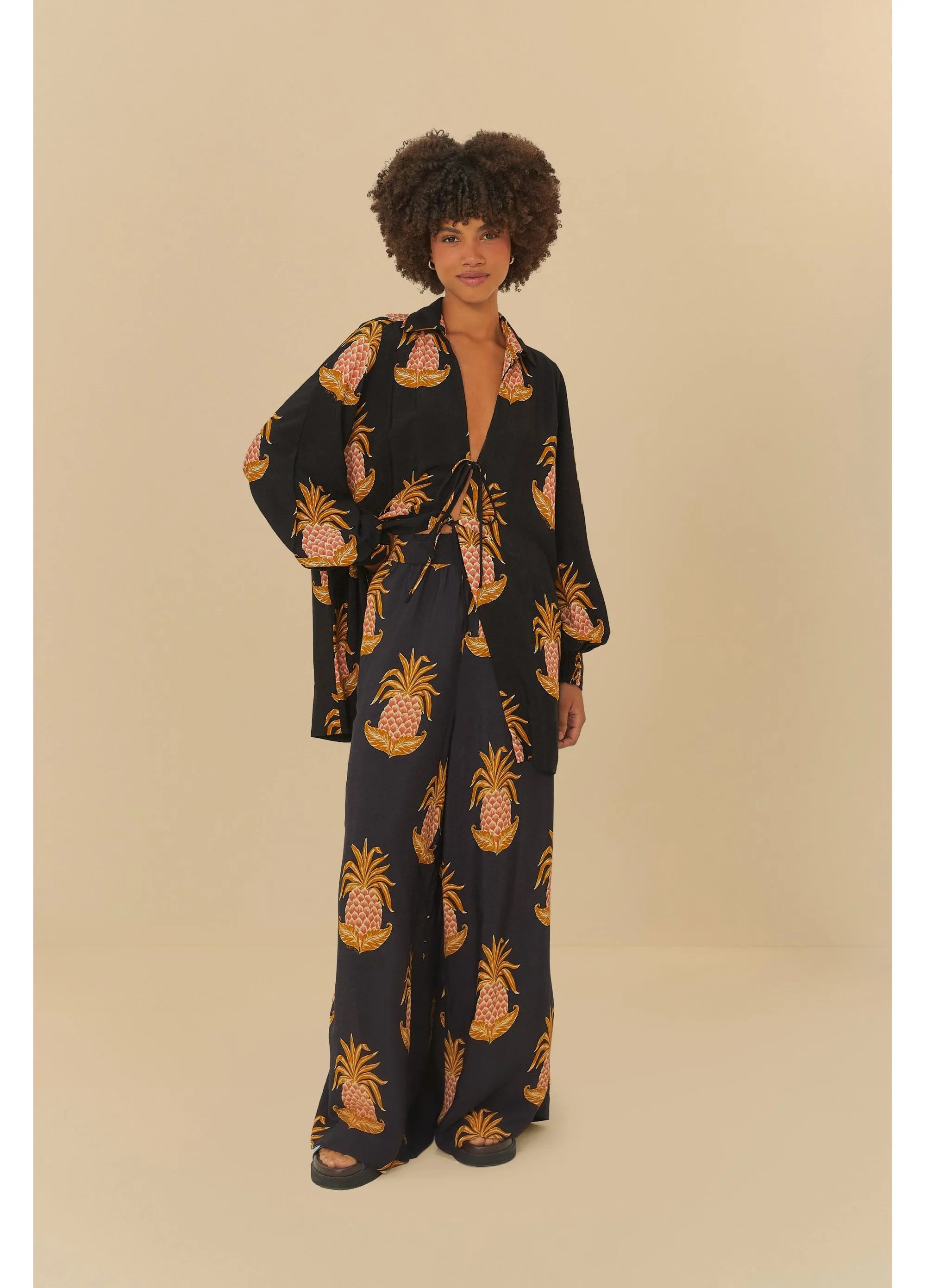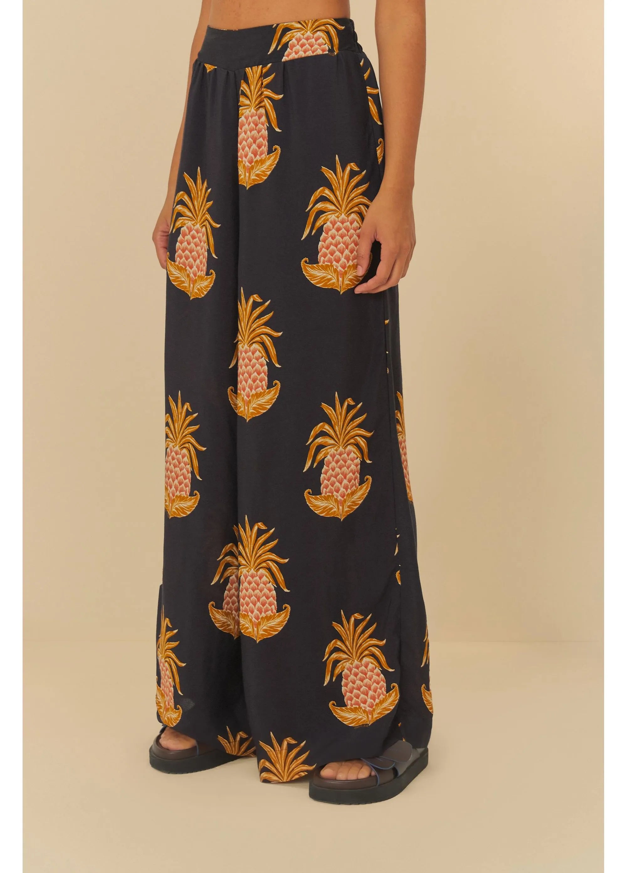 CALCA FARM PANTALONA ALMAFI ABACAXI Cor: PRETO Referência: 337576 calça pantalona amalfi abacaxi. marcada por sua fluidez e cintura alta,...