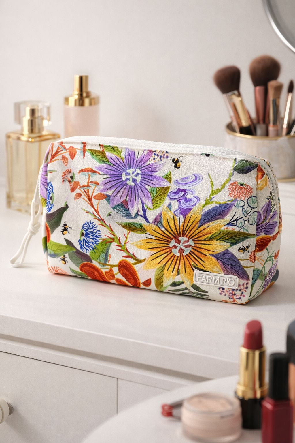 Organize seu mundo com estilo! A Maxi Necessaire Farm Oras Bolas traz o charme tropical do Midnight Macaw para guardar...