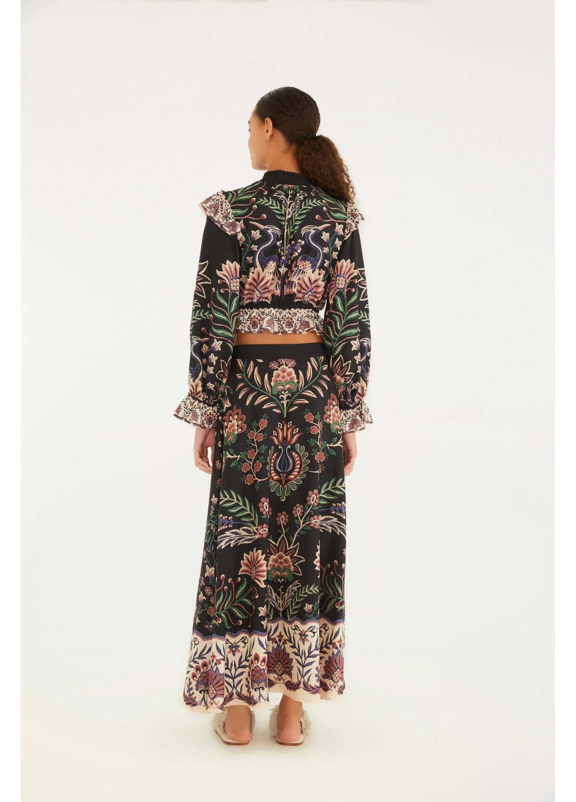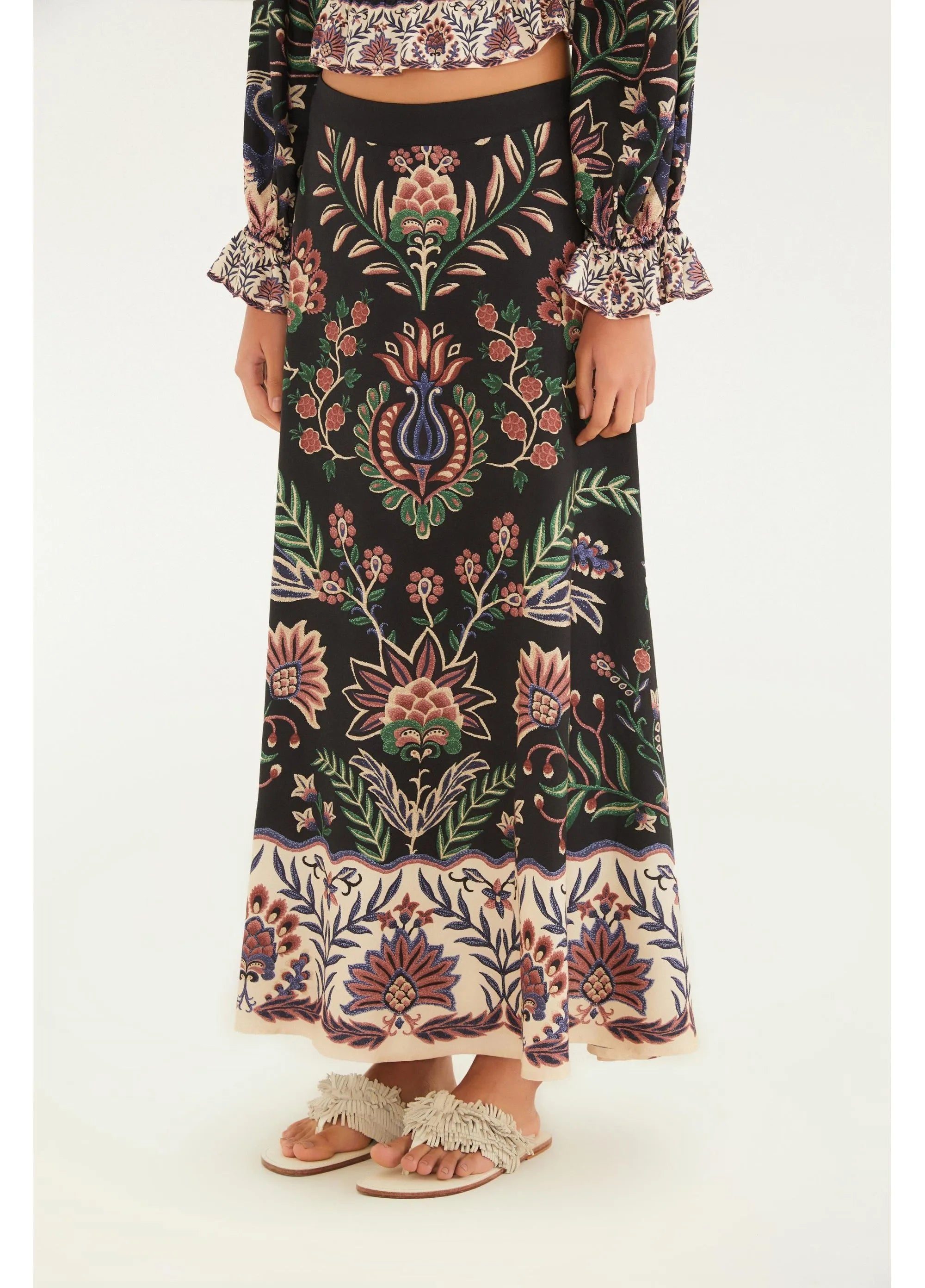SAIA FARM EVASE ESTAMPADA JARDIM MARAVILHOSO Cor: PRETO Referência: 342498 saia evasê jardim maravilhoso. delicada e fluida, apresenta um corte...