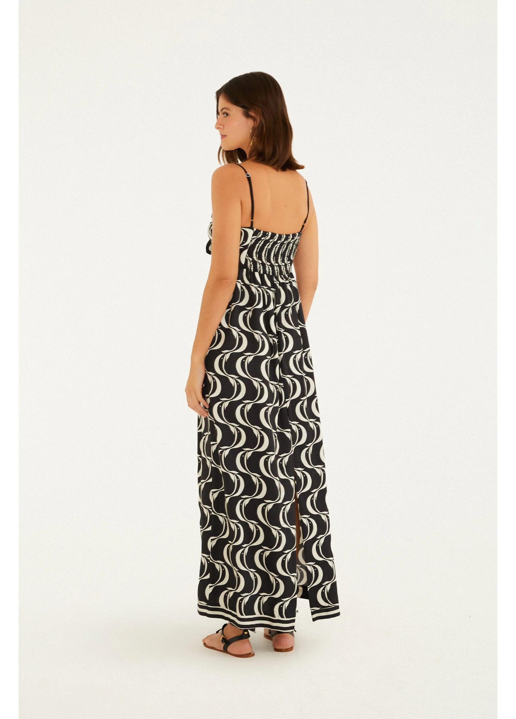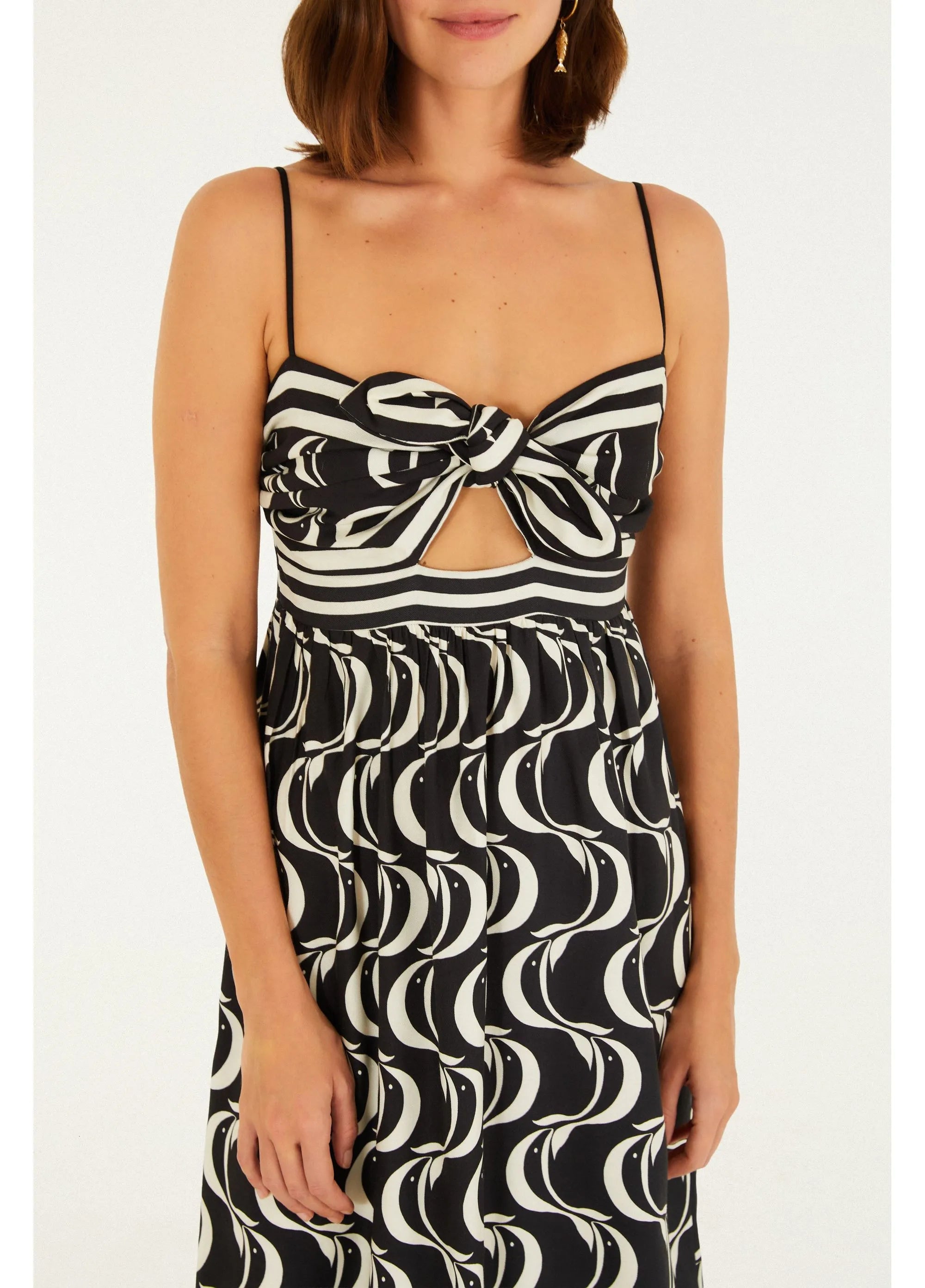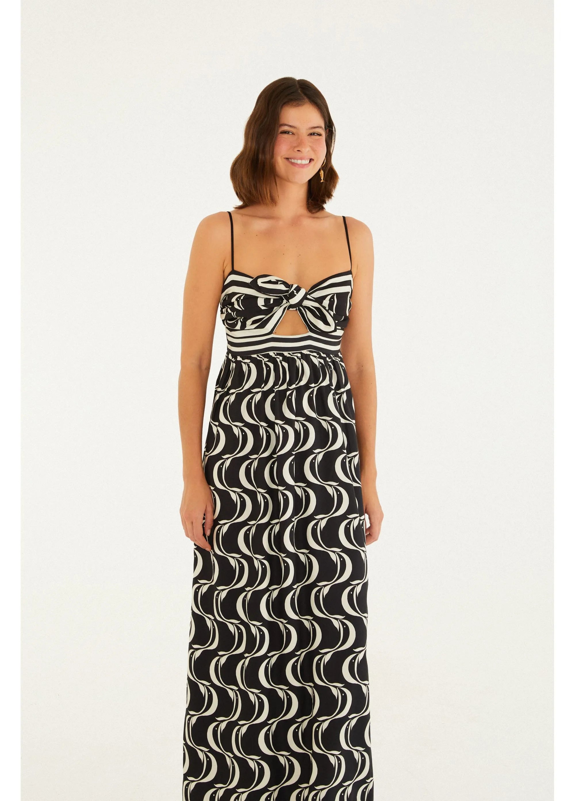 VESTIDO FARM NÓ ESTAMPADO PEIXE COPA Cor: PRETO Referência: 354412 vestido nó estampado peixe copa. com alças finas e decote...