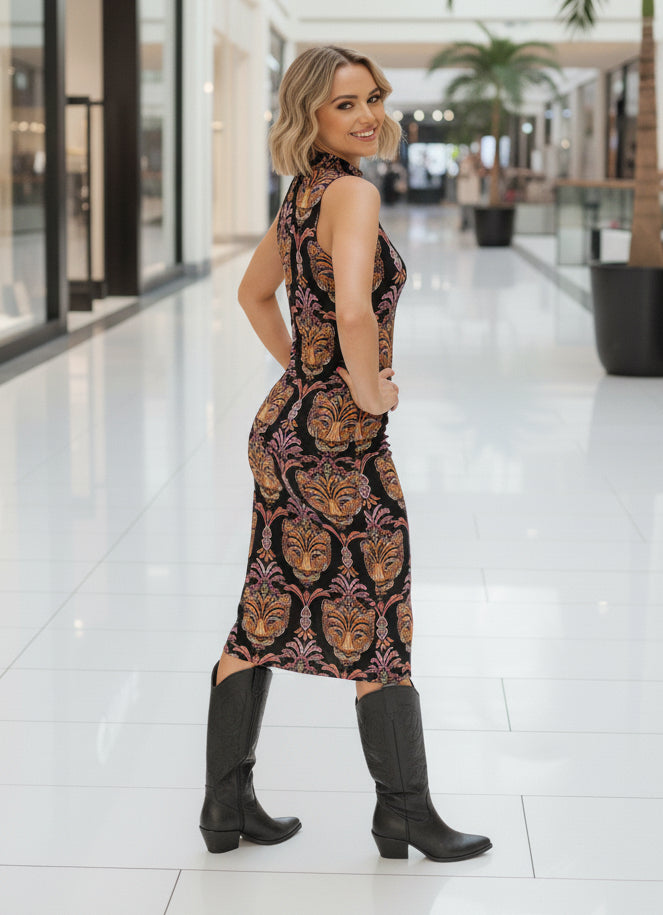 Desfile de estilo com este lançamento exclusivo Farm que abraça seu corpo com precisão impecável. O estampa pantera boho traz...