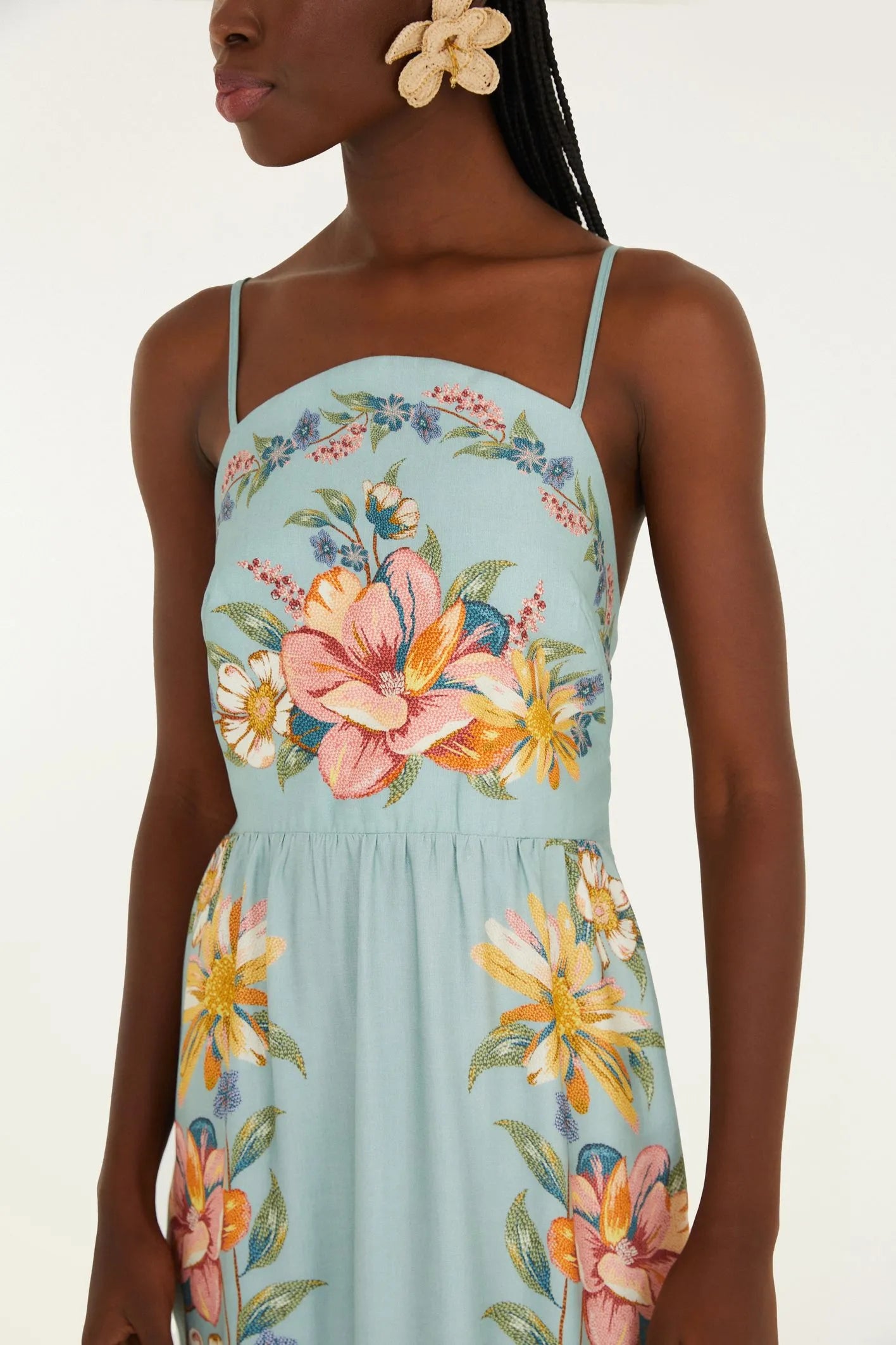 VESTIDO FARM CROPPED LONGO ESTAMPADO MAIRA Cor: VERDE CLARO Referência: 346214 vestido cropped estampado maira. destaca-se pelo decote quadrado que...